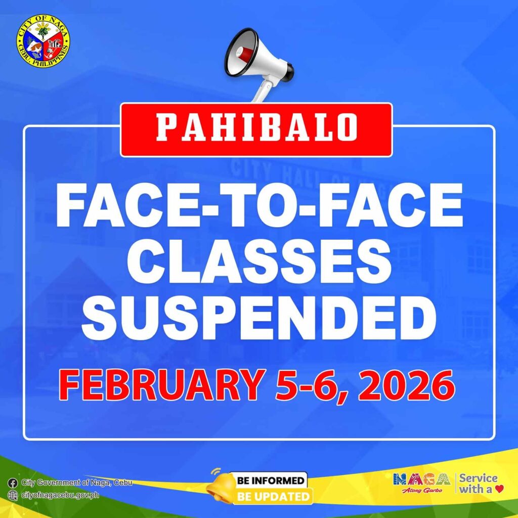 Pinaagi sa direktiba ni Mayor Val, sa koordinasyon ni Schools Division Superintendent Dr. Ronald Gutay, gipahibalo ang tanan nga SUSPENDED ANG TANANG FACE-TO-FACE CLASSES sa tanang lebel sa public ug private schools sa Dakbayan sa Naga sugod ugma, Huwebes, Pebrero 5, 2026, hangtod Biyernes, Pebrero 6, 2026.